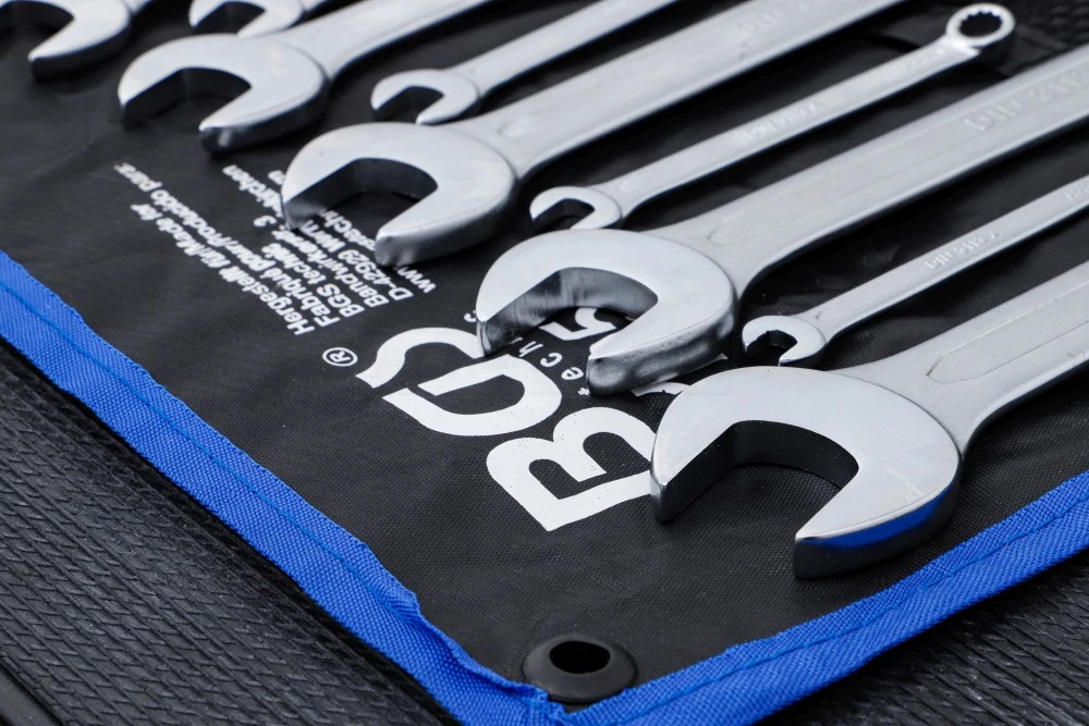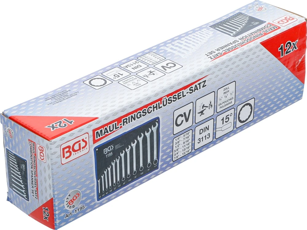 - Maul-Ringschlüssel: SW 1/4″ – 5/16″ – 3/8″ – 7/16″ – 1/2″ – 9/16″ – 5/8″ – 11/16″ – 3/4″ – 13/16″ – 7/8″ – 15/16″