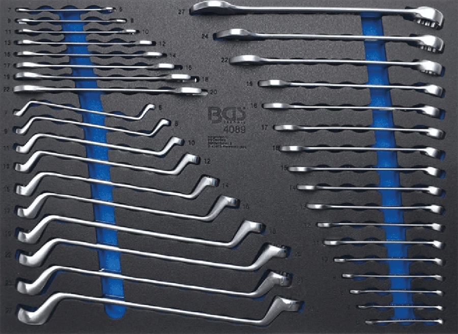 - 8 Doppel-Maulschlüssel: SW 6 x 7 – 8 x 9 – 10 x 11 – 12 x 13 – 14 x 15 – 16 x 17 – 18 x 19 – 20 x 22 mm