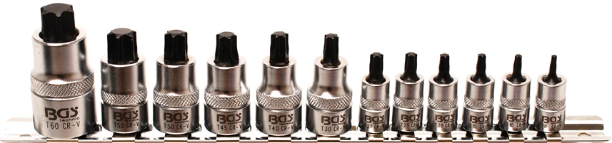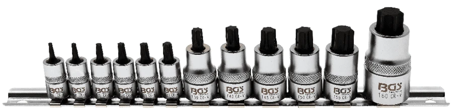 - Bit-Einsätze, Länge 38 mm, Antrieb Innenvierkant 10 mm (3/8″), Abtrieb T-Profil (für Torx): T30 – T40 – T45 – T50 – T55