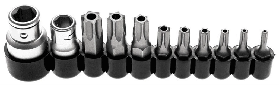 - 6 Bits, Antrieb Außensechskant 6,3 mm (1/4″), Abtrieb T-Profil (für Torx) T10 – T15 – T20 – T25 – T27 – T30