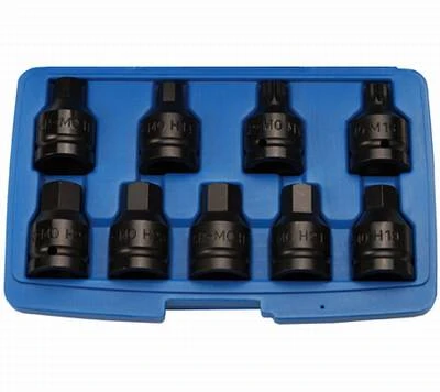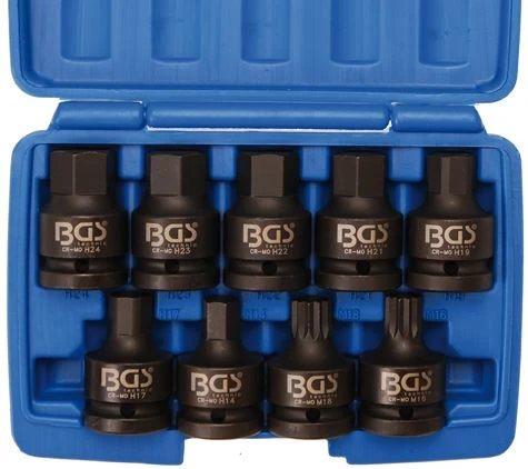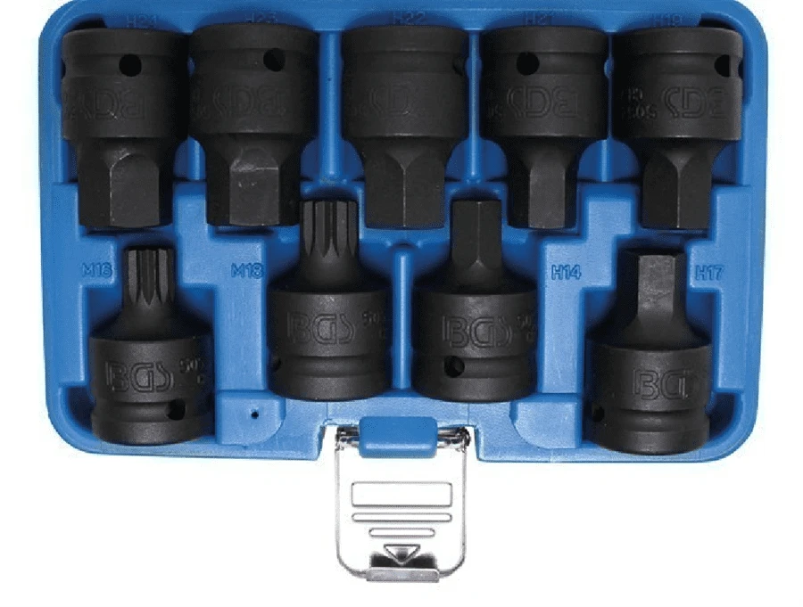 - Kraft-Bit-Einsätze, Antrieb Innenvierkant 20 mm (3/4″), Abtrieb Innensechskant: 14 – 17 – 19 – 21 – 22 – 23 – 24 mm