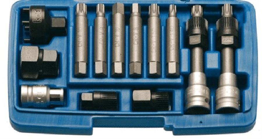 - spezieller Bitsatz mit Lichtmaschinen-Kombischlüsseln zur Montage der Freilauf-Riemenscheibe