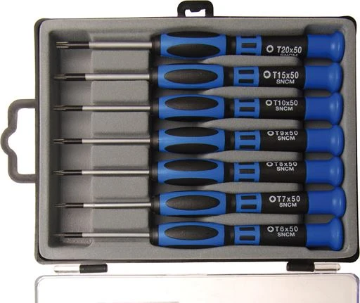 - Präzisions-Schraubendreher T-Profil (für Torx): T6 x 50 mm – T7 x 50 mm – T8 x 50 mm – T9 x 50 mm – T10 x 50 mm – T15 x 50 mm – T20 x 50 mm