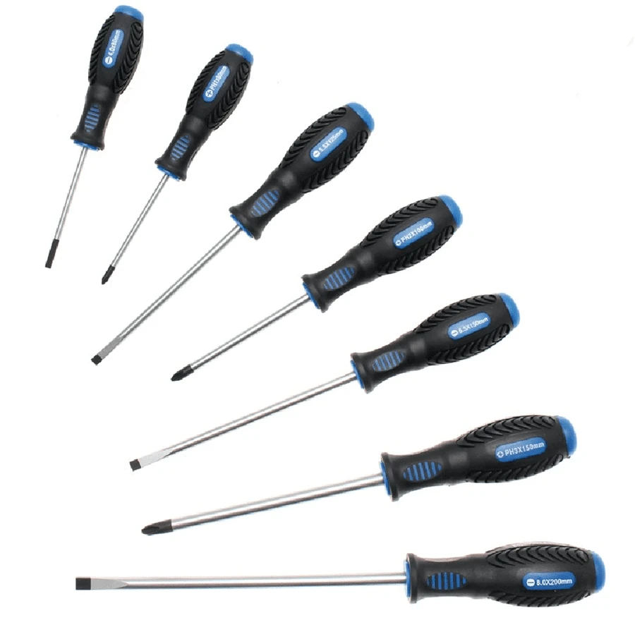 - Schraubendreher Schlitz: 4 x 80 mm – 5,5 x 125 mm – 6,5 x 150 mm – 8,0 x 200 mm