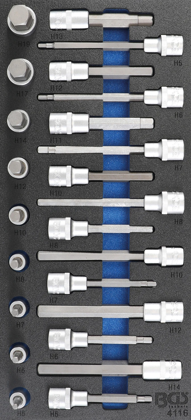 - 9 Bit-Einsätze, 12,5 mm (1/2″), Innensechskant 5 – 6 – 7 – 8 – 10 – 12 – 14 – 17 – 19 mm, Länge: 55 mm
