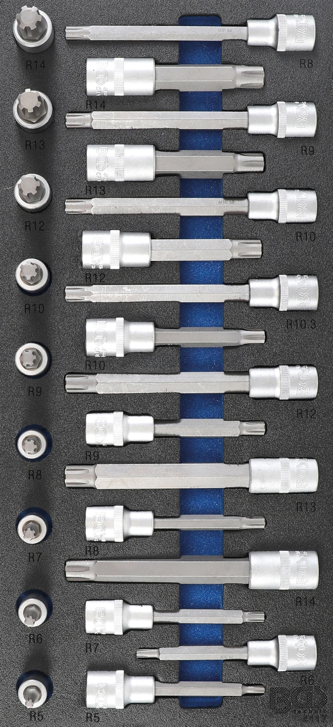 - 9 Bit-Einsätze, 12,5 mm (1/2″), Keil-Profil (für RIBE) M5 – M6 – M7 – M8 – M9 – M10 – M12 – M13 – M14 Länge: 55 mm