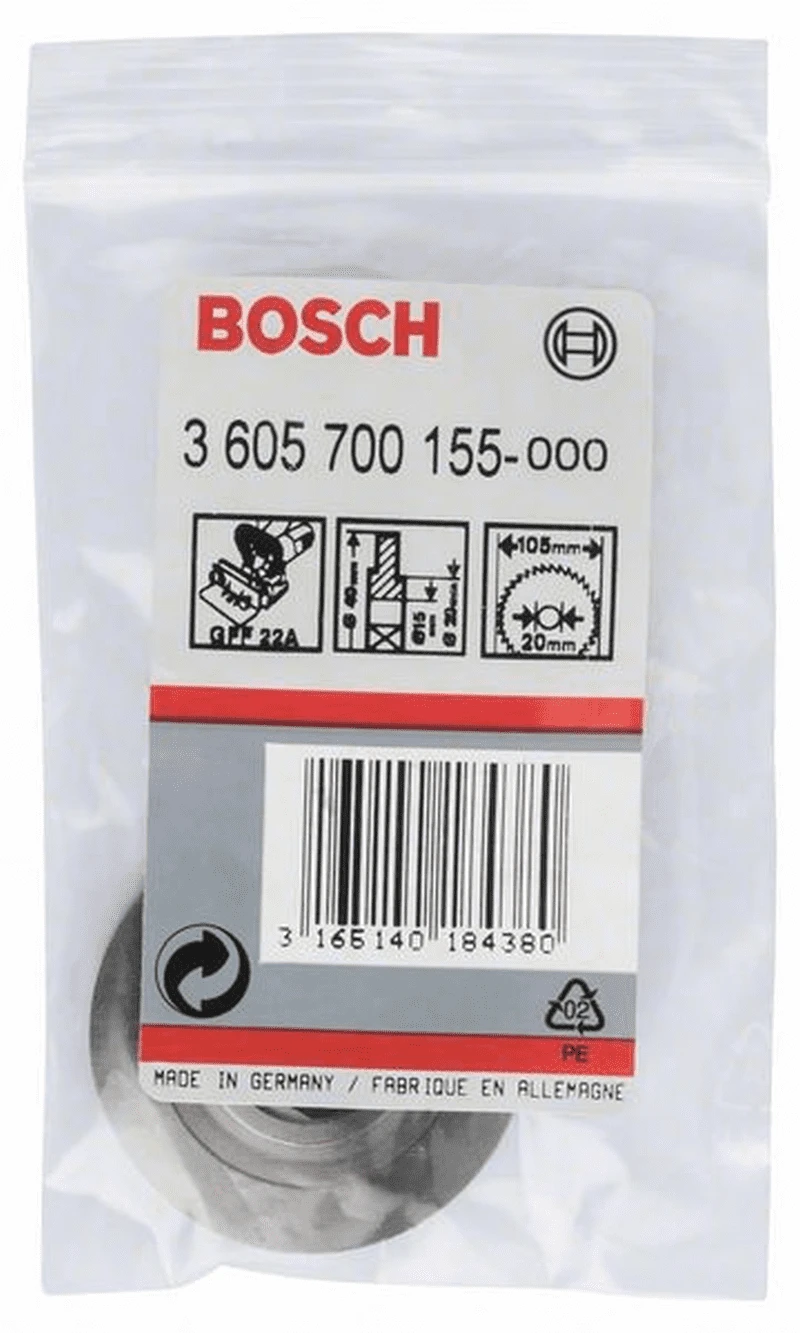 Aufnahmeflansch für Scheibenfräser. Durchmesser: 105 mm für Bosch-Universalfräse. Durchmesser: 20 mm. Zum Fräsen von Schattenfugen, Längsnuten und Flachdübelverbindungen in Holz. Einfaches Herstellen des Rustikal-Looks mit der vielseitigen Bosch-Universalfräse und passendem Bosch-Nutfräser. Passend zu GFF 22 A Professional.