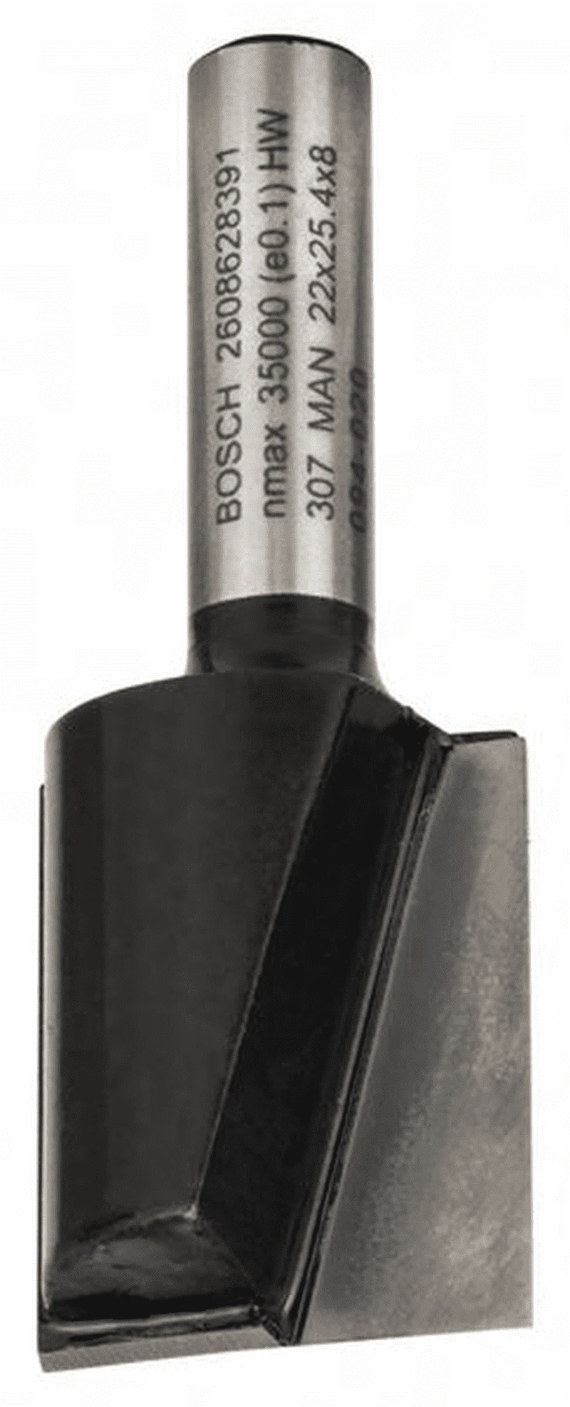 Nutfräser, zweischneidig, Hartmetall. Schaft: 8 mm, Durchmesser: 22 mm, Arbeitslänge: 25 mm, Gesamtlänge: 56 mm. Zum universellen Fräsen, Nuten oder Falzen mit Oberfräsen. Zum Formatieren von regelmäßigen oder geschweiften Werkstücken. Geeignet für Massivholz, Plattenwerkstoffe wie Span- oder MDF-Platte, Kunststoffe oder abrasive Materialien wie Corian.